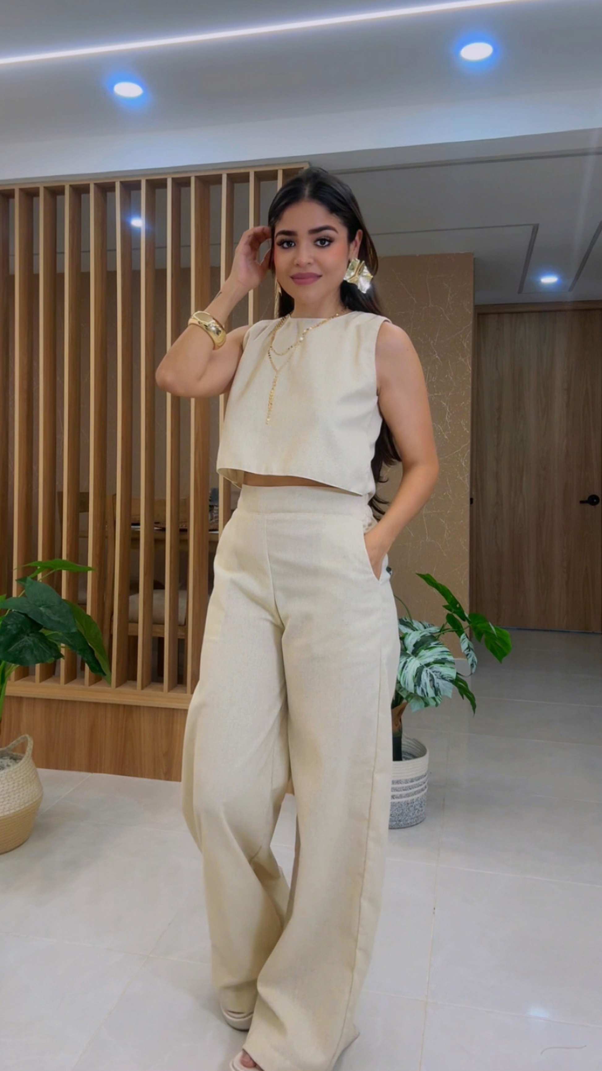 Conjunto en lino Olán con top de amarre en espalda y pantalón palazzo con elástico posterior para un ajuste cómodo y sofisticado.